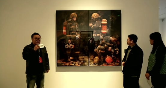 在导览过程中,湖北美术学院绘画学院副院长邵昱皓接受采访,王平秘书长对邵昱皓的水彩直送作品《履陷如夷-中国消防力量》进行了讲解与评述,邵昱皓副院长介绍了作品的选题背景来自于四川凉山山火的救援过程,并结合湖北美术学院水彩画系的综合材料课程讲述作品的创作意图。王平秘书长从作品的色彩对比、青年水彩艺术家对材料的把握和绘画语言的独特表达等方面给予高度肯定。