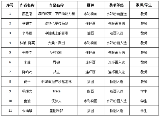 湖北美术学院绘画学院师生共11件(组)作品入选,其中邵昱皓、张耀文老师分别获水彩粉画直送作品和连环画直送作品。于轶文、李菲、陈鸣鸣、李陈辰、林波(含合作作者陈亮)、倪平六位老师与三位研究生鲁波、杨博文、朱涵璞的作品分别入选,入选作品涵盖多个绘画门类,集中体现了我院在艺术创作与人才培养方面的扎实成果与综合实力。2025年11月26日上午,师生代表邵昱皓、张浩、张耀文、李陈辰、鲁波等人参加开幕式。