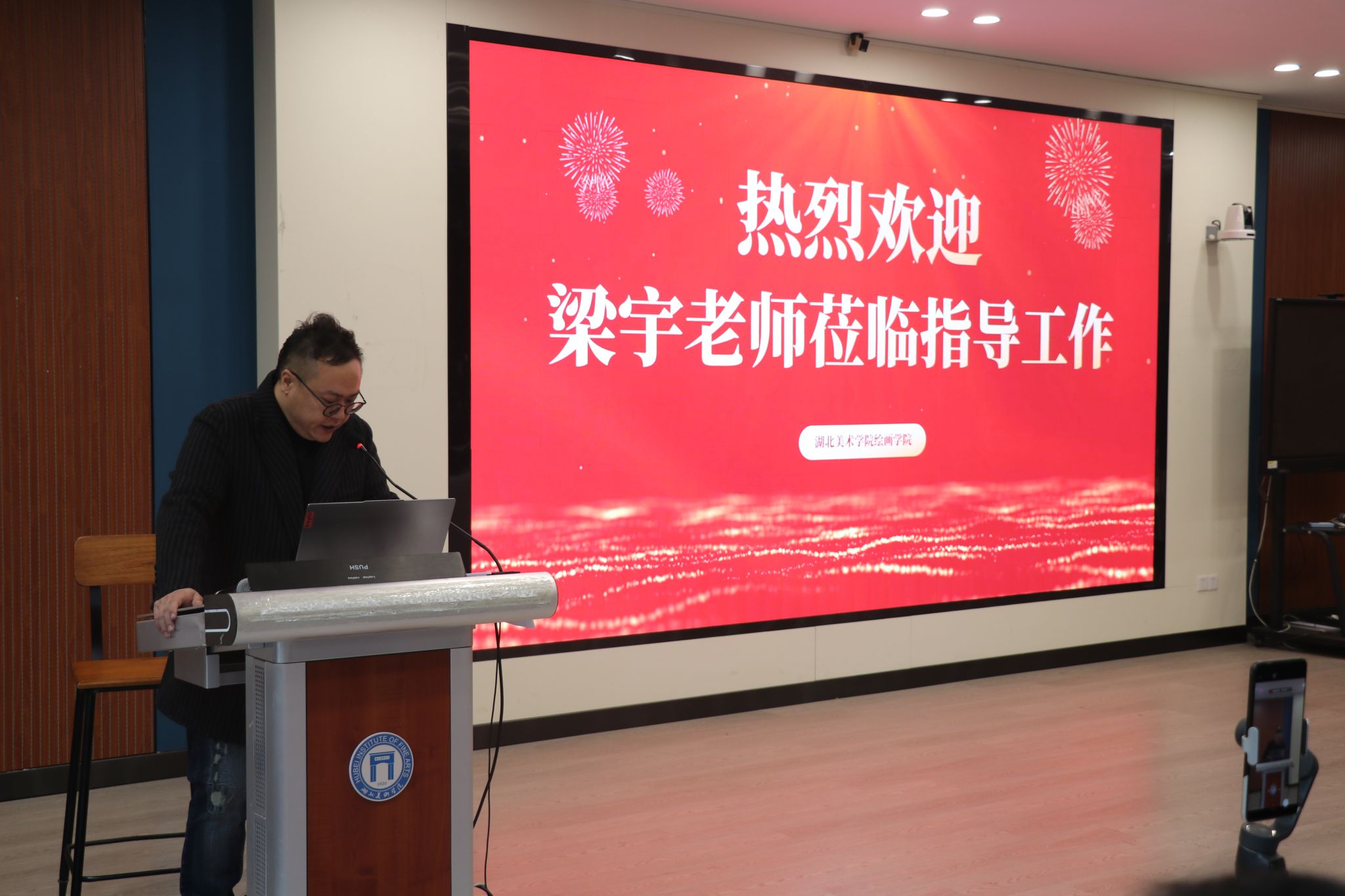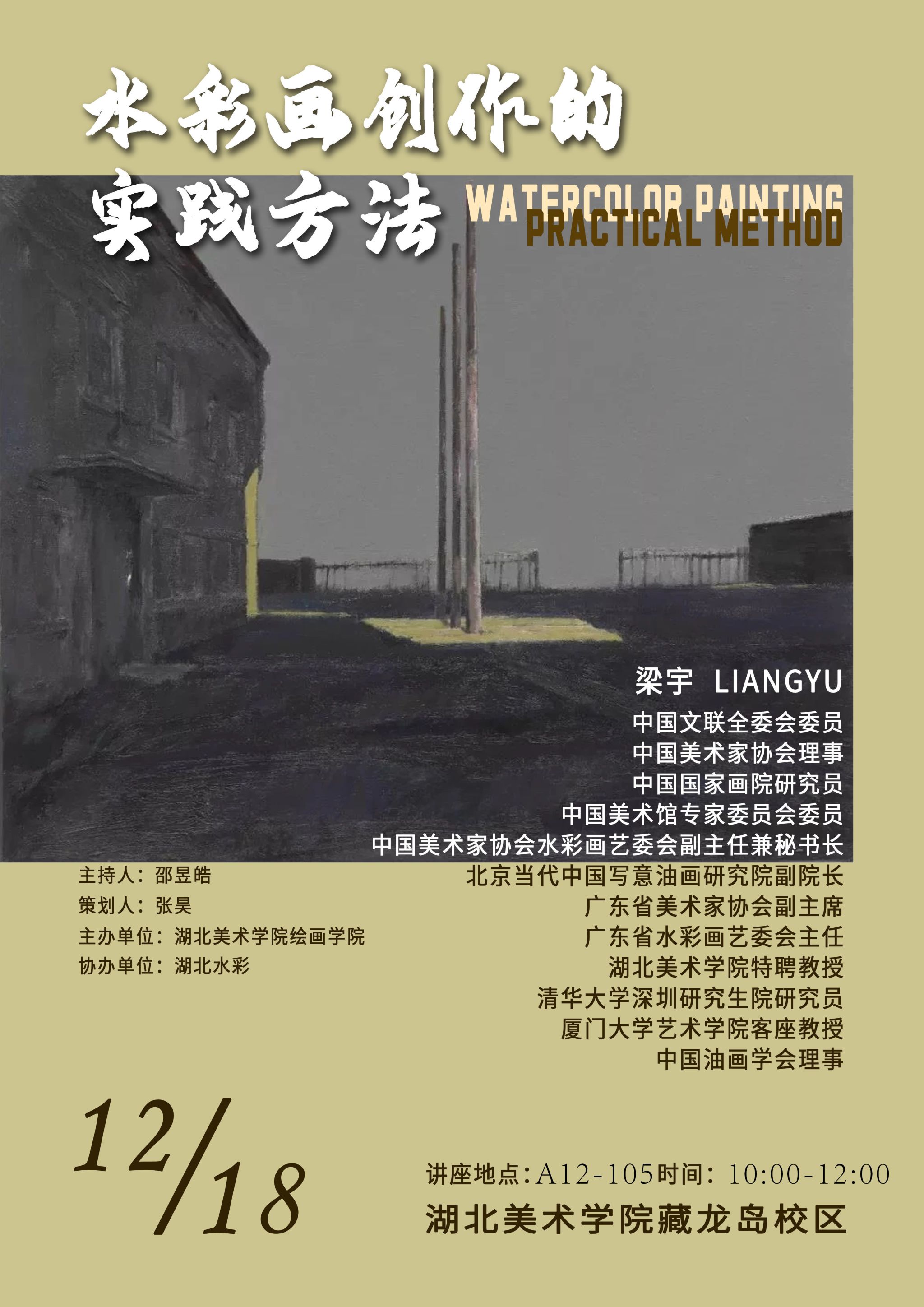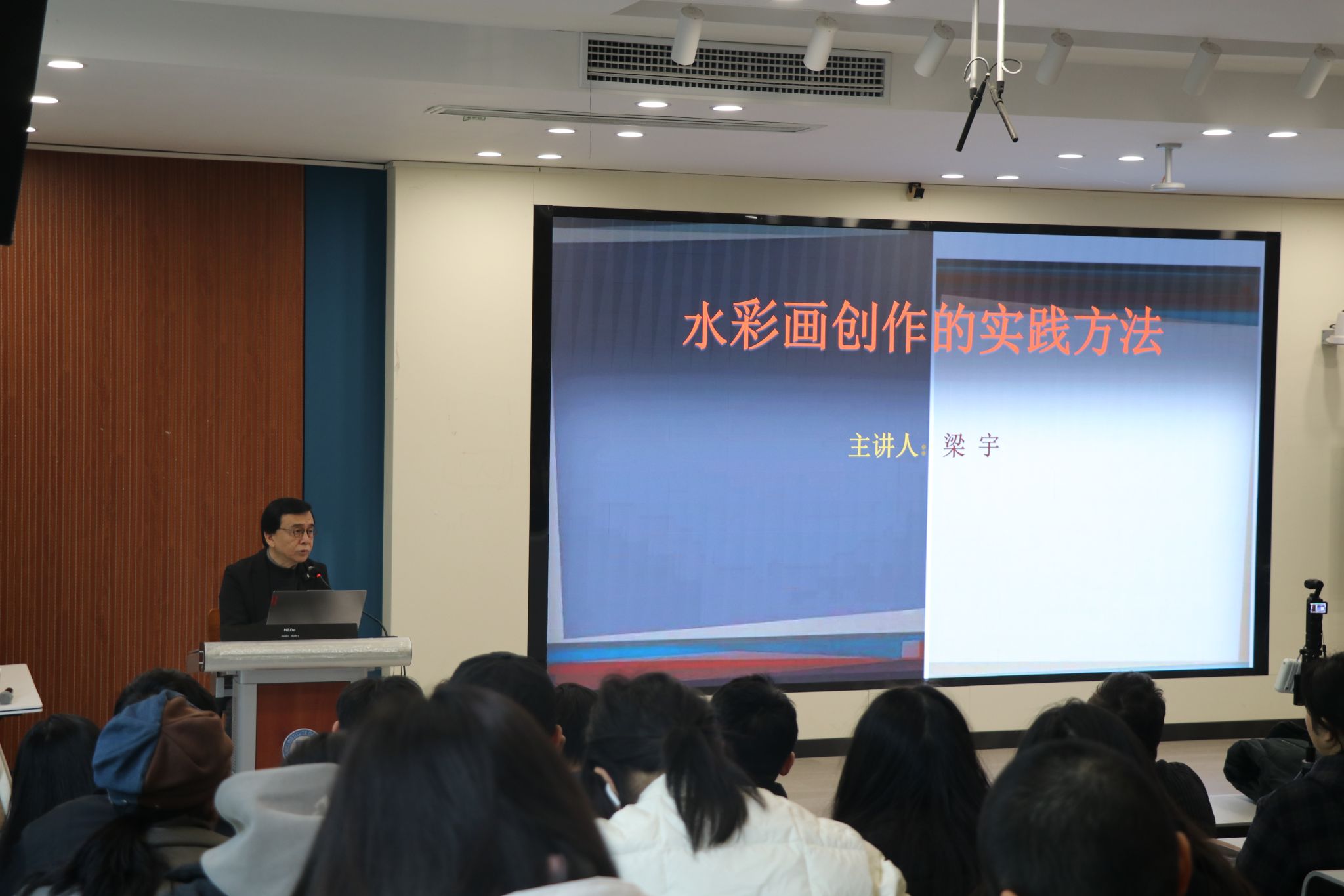 2025年12月18日,中国文联全委会委员、中国美术家协会理事,中国美术家协会水彩画艺委会副主任兼秘书长梁宇教授应邀在湖北美术学院A12-105开展讲座,主题为“水彩画创作的实践方法”,讲座由绘画学院副院长邵昱皓主持。