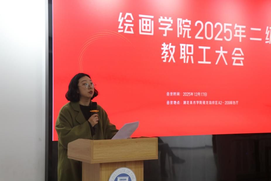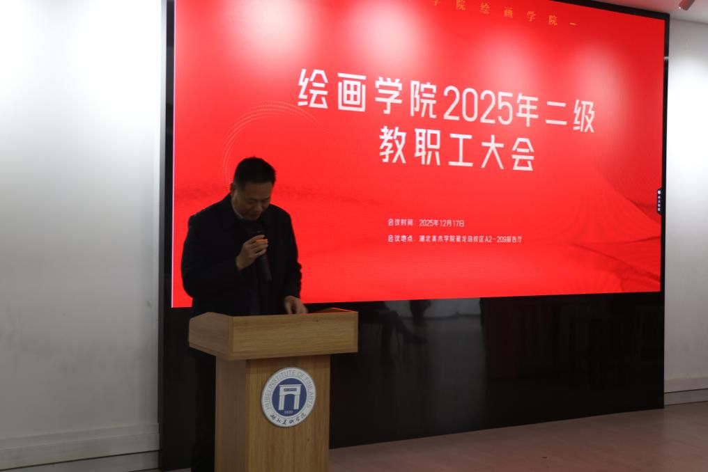 根据《湖北美术学院工会委员会关于召开二级单位教职工大会的通知》,2025年12月17日下午15:40,绘画学院在A2-209报告厅召开2025年二级教职工大会。绘画学院领导班子及全体教职工参加会议。会议由绘画学院党委书记夏新兵主持。