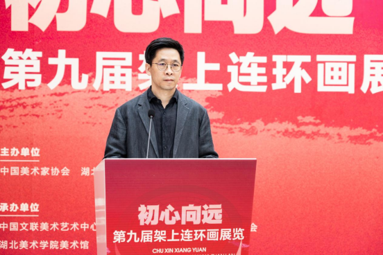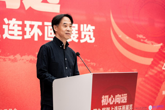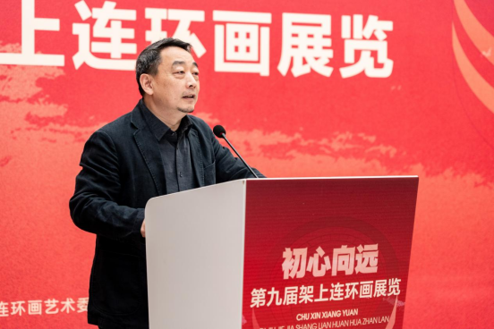 屈健在致辞中表示,连环画是中国本土最具群众基础的大众叙事艺术。本届展览以“初心向远”为主题,作品在叙事语言更加多样、艺术表达勇于突破、创作导向鲜明坚定等三个维度集中展现了连环画艺术守正创新的时代风貌。希望广大连环画艺术创作者始终坚守人民立场,筑牢创作之根,让连环画真正成为“为人民抒情、为人民抒怀”的叙事载体;坚持守正创新,把握发展之要,实现艺术价值与时代价值的双重升华;加强代际传承,夯实人才之基,让连环画这一“中国叙事”的文脉薪火永续、代代相传。希望以此次展览为新的起点,共同推动中国连环画事业在新时代续写新篇章。